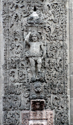 En esta unión se encuentra un elemento decorativo que le ha dado carácter y sentido personal a la casa, ya que además de estar profusamente decorada (estilo churrigueresco) con motivos vegetales, emerge de entre ellas la figura de un niño o ángel, que descansa un pie sobre la cabeza de un león y sostiene graciosamente con el brazo derecho una cesta llena de frutas, símbolo de la abundancia.[3]