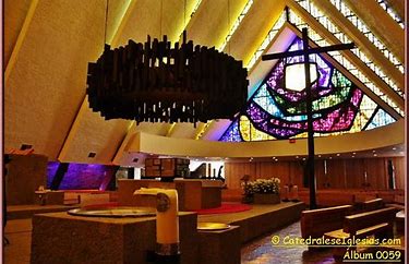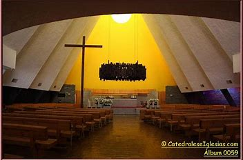 En el interior, aunque con planta circular, resalta el altar hacia donde se dirigen las entradas de luz, que se vuelve cálida al pasar por los vitrales y al rematar en el muro amarillo y curvo del fondo. El altar compuesto por un elemento escultural de acero suspendido desde arriba, los sagrarios y la cruz, todos diseños del arquitecto, repiten los temas geométricos que se encuentran en todo el proyecto, como el círculo, los prismas rectangulares y la cruz.[1]