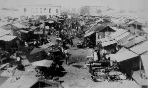 En 1944, el tianguis de Tepito abarcaba la totalidad de la plazuela. Según la descripción, en las calles que ya llevaban el nombre de Fray Bartolomé de las Casas había incontables barracas, formando un montón informe de madera, gente y desperdicios."[1]